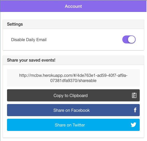 This isn’t going to be a lecture about how powerful social sharing plugins are in viral/organic growth. I’m less concerned about that and more concerned about the end-user experience. Considering I already had my own Firebase database, enabling this was actually trivial. Create a route outside the context of the app (otherwise users would get redirected to login) that took in the user’s ID (from the URL) and pulled out the list of their saved events. Simple, straightforward, elegant. Add in a few social share buttons for convenience and the app practically markets itself.