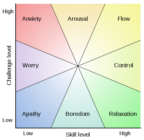 Concidentally, research has shown a fairly high overlap between the conditions for flow and the basis of SDT. Flow requires a level of challenge that is adequately matched to the abilities of the participant (competence), the activity must have clear goals an progress (relatedness - sort of), and the task must present clear, immediate, and constant feedback, so that the participant can adjust performance. Mihaly Csikszentmihalyi (“cheek-sent-mee-hah-yee”), a world leader in flow, published this graph to express the relationship between challenge and skill: