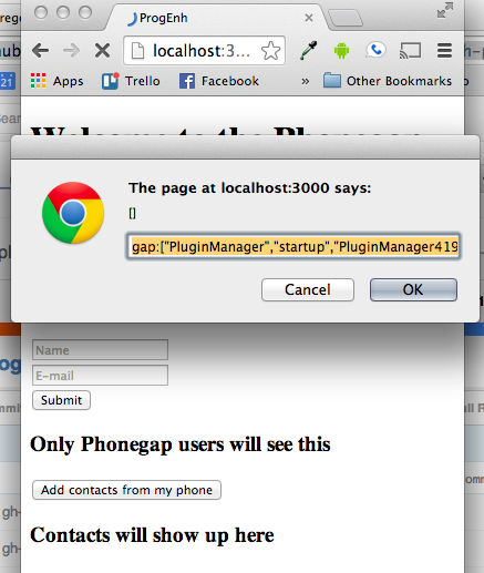 This guide won’t go into detail about how exactly to set up a phonegap application, or how to get started with Rails. I’ll leave that as an exercise to the reader, but also you can clone my github repo which has all of that (and many other things) done for you. You’ll also need to, for the purpose of this demo, add the Contacts plugin to your Phonegap app.