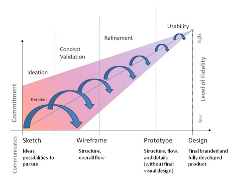 The exact definition of fidelity isn’t exactly clear, but it roughly refers to the level of detail your current iteration includes. It’s often used in the context of prototyping, but it can refer to existing products as well. Your typical startup MVP is a high-fidelity prototype but a low-fidelity product. Fidelity exists on a continuum, with the lower end including concepts, sketches, and rough wireframes, and the higher end being branded/visually design and interactive prototypes. I’ve seen far too many products that jump right into the deep end of fidelity, missing out on all of the potential learning from testing lower fidelity prototypes.