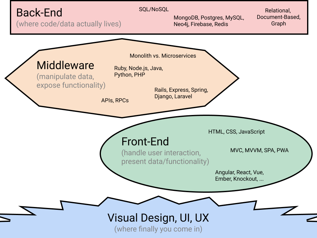 A brief note: this pretty much only covers web technologies, meaning we’re going to ignore native development (iOS, Android, OSX, Windows, etc). Most of this is the same up until you get to Front-End, where you’re just using different technologies.